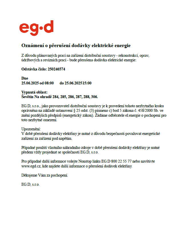 EG.D, a.s., oznamuje, že ve středu dne 25.06.2025 bude v čase od 08:00 do 15:00 hodin přerušena dodávka elektrické energie v oblasti: Na ohradě 284, 285, 286, 287, 288, 306, Ševětín, viz příloha.