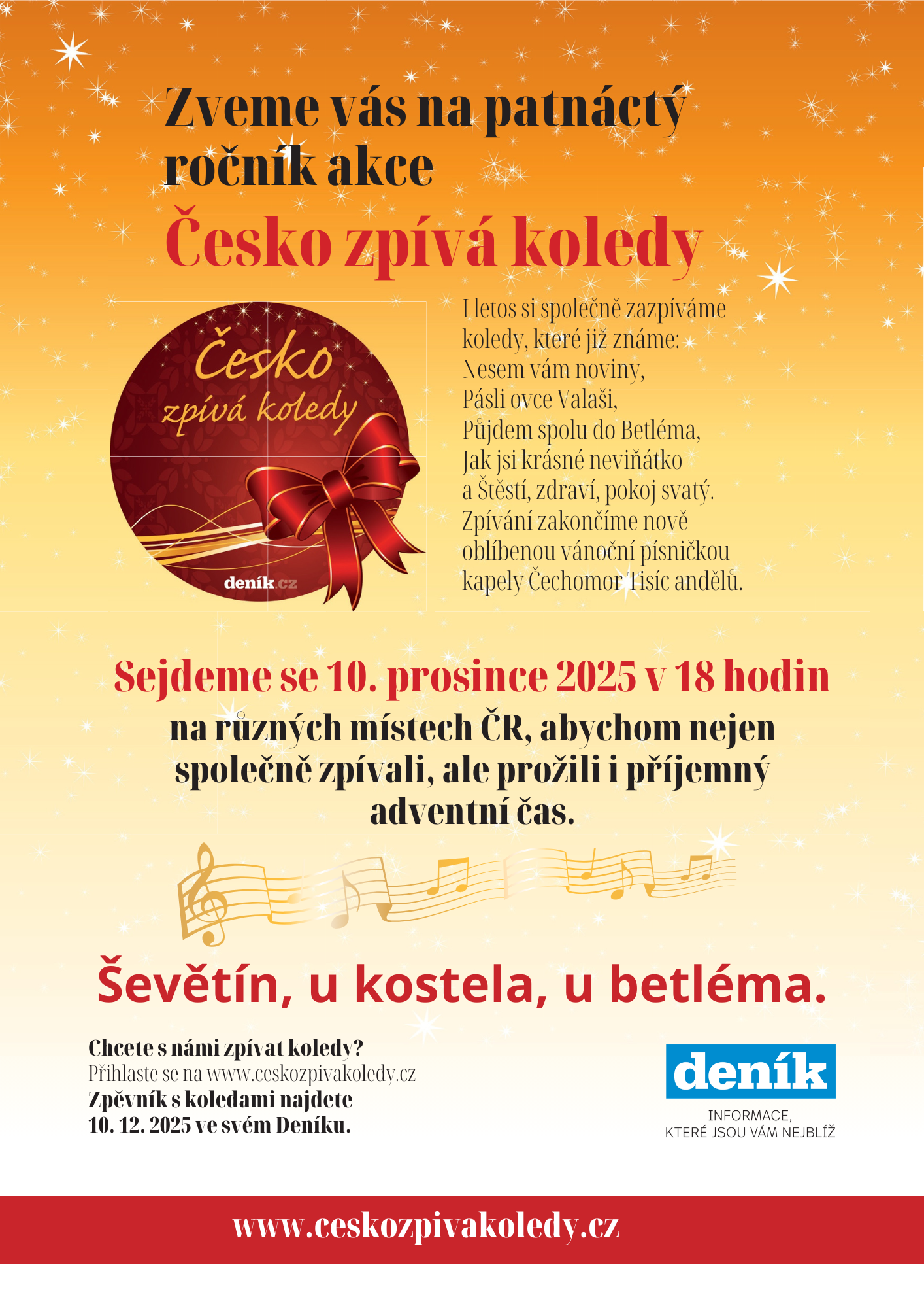 i letos si společně zazpíváme u našeho krásného betléma ve středu 10. prosince 2025 v 18 hodin při celorepublikové akci Česko zpívá koledy. Všichni jste srdečně zváni.
